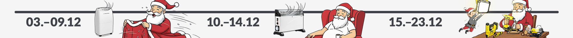 Disfruten de tres fases promocionales consecutivas en las que ofreceremos productos seleccionados con descuentos festivos especialmente atractivos. Desde el clima interior perfecto y una acogedora calidez hasta potentes electrodomésticos del taller de Papá Noel: cada periodo promocional revela nuevas y potentes ventajas para la temporada de invierno e ideas perfectas para regalos.