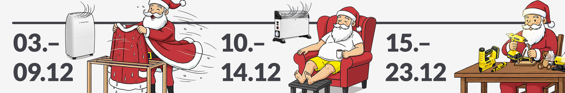 El aire está cargado de expectación, porque en TROTEC la temporada navideña anuncia la época más acogedora del año. Para que disfruten de semanas de alegría festiva hasta bien entrado el nuevo año, ponemos bajo el árbol de Navidad los mejores ayudantes para su hogar. Porque Papá Noel no solo adora las galletas, sino también la tecnología funcional de TROTEC.